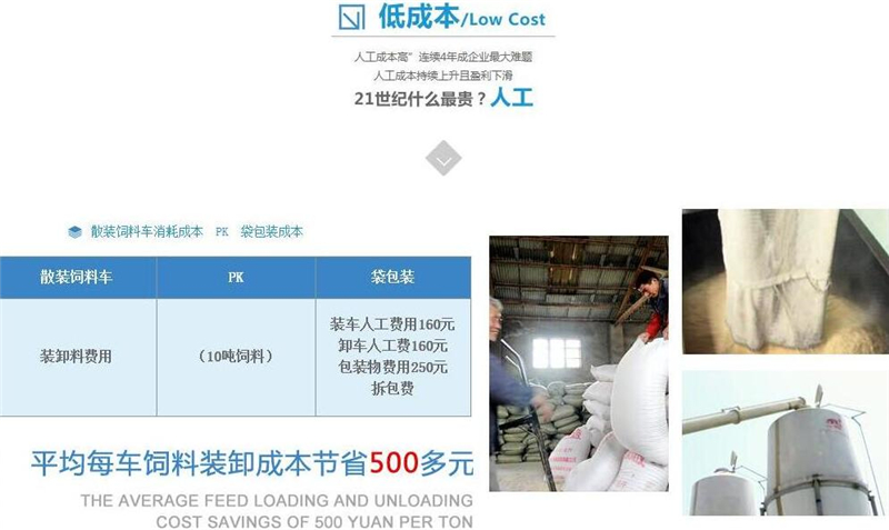 散裝飼料車的優(yōu)勢: 散裝飼料的生產可實現(xiàn)直接生產直接裝車,隨產隨出,不需要進行提前備貨,不占用倉儲設施,也不會出現(xiàn)停產等待拉料的現(xiàn)象,使飼料生產實現(xiàn)計劃管理,生產效率得到提升。 ★獨有倒梯形設計,散裝飼料在罐體內密封輸送,V字形罐體卸料順暢,減少飼料的耗損,保證質量,避免污染。 ★運輸比包裝成袋運輸不但節(jié)省勞動力,而且成本較低。 ★可選電動卸料、全液壓卸料、氣卸為全自動上料卸料,可連續(xù)作業(yè),大大提高生產效率。 ★罐體內可加裝分倉,可同時運輸多種不同類的飼料或膨人介質。部件標準化,容易維修保養(yǎng)。 頂部進料倉