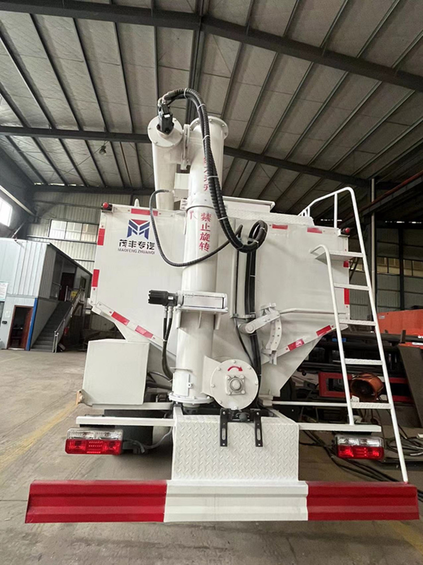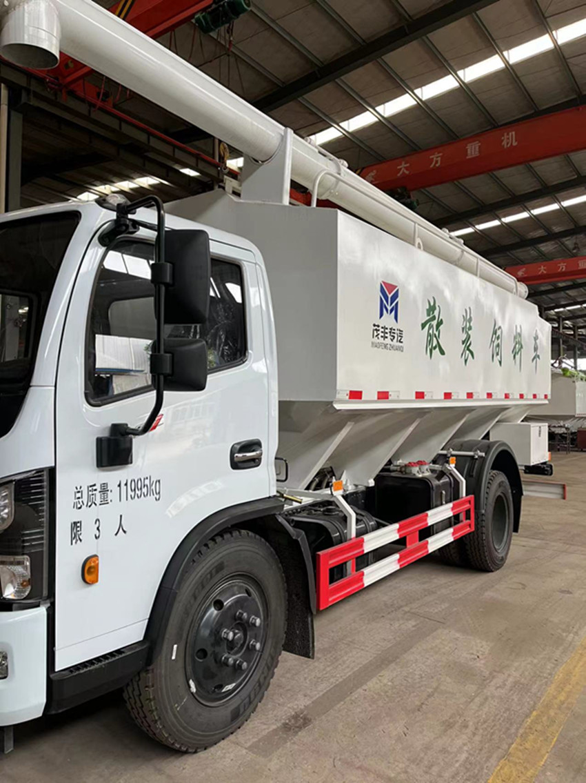 散裝飼料運輸車,散裝飼料車的飼料罐架設在卡車的底盤上,罐頂開有進料口.頂部的一根螺旋輸送卸料管(俗稱卸料絞龍)則可自由回轉和抬升,抬升的仰角可達60度。運輸時,頂部的螺旋管平臥在罐頂;卸料時則抬起,使管端的出料口與畜禽飼養(yǎng)場貯料罐頂部的進料門相接,駕駛室內裝有操縱裝置(操縱裝置也可裝置在罐體尾部),卸料時通過車底的動力輸出軸和減速器來驅動螺旋,以完成卸料。