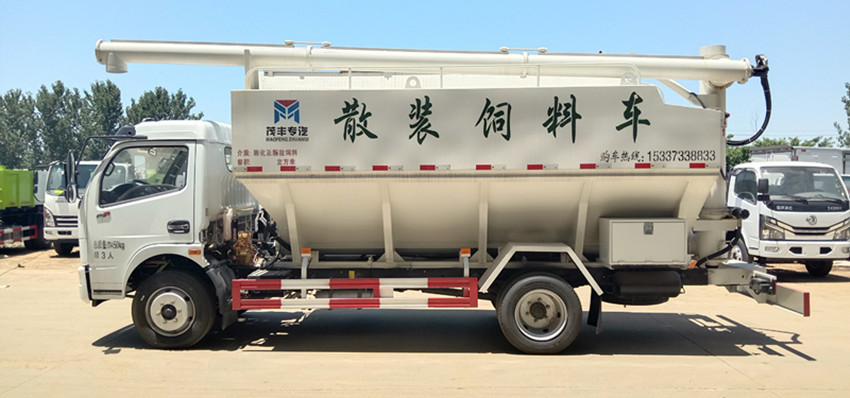 散裝飼料運(yùn)輸車,散裝飼料車的飼料罐架設(shè)在卡車的底盤上,罐頂開有進(jìn)料口.頂部的一根螺旋輸送卸料管(俗稱卸料絞龍)則可自由回轉(zhuǎn)和抬升,抬升的仰角可達(dá)60度。運(yùn)輸時(shí),頂部的螺旋管平臥在罐頂;卸料時(shí)則抬起,使管端的出料口與畜禽飼養(yǎng)場(chǎng)貯料罐頂部的進(jìn)料門相接,駕駛室內(nèi)裝有操縱裝置(操縱裝置也可裝置在罐體尾部),卸料時(shí)通過車底的動(dòng)力輸出軸和減速器來驅(qū)動(dòng)螺旋,以完成卸料。