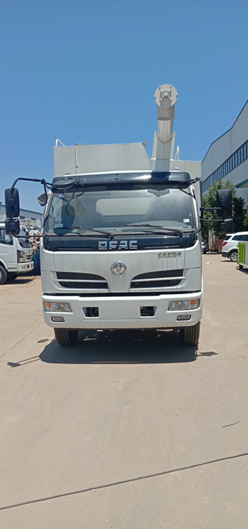 散裝飼料運輸車,散裝飼料車的飼料罐架設在卡車的底盤上,罐頂開有進料口.頂部的一根螺旋輸送卸料管(俗稱卸料絞龍)則可自由回轉和抬升,抬升的仰角可達60度。運輸時,頂部的螺旋管平臥在罐頂;卸料時則抬起,使管端的出料口與畜禽飼養(yǎng)場貯料罐頂部的進料門相接,駕駛室內裝有操縱裝置(操縱裝置也可裝置在罐體尾部),卸料時通過車底的動力輸出軸和減速器來驅動螺旋,以完成卸料。