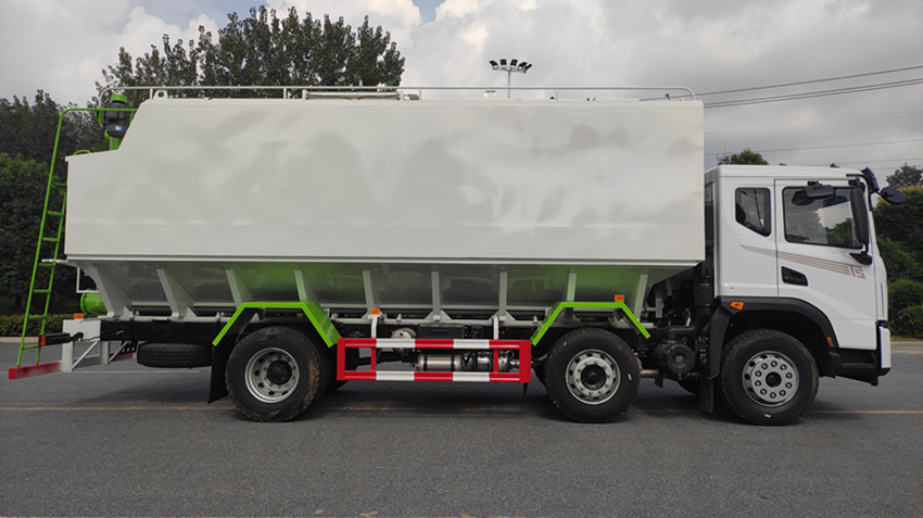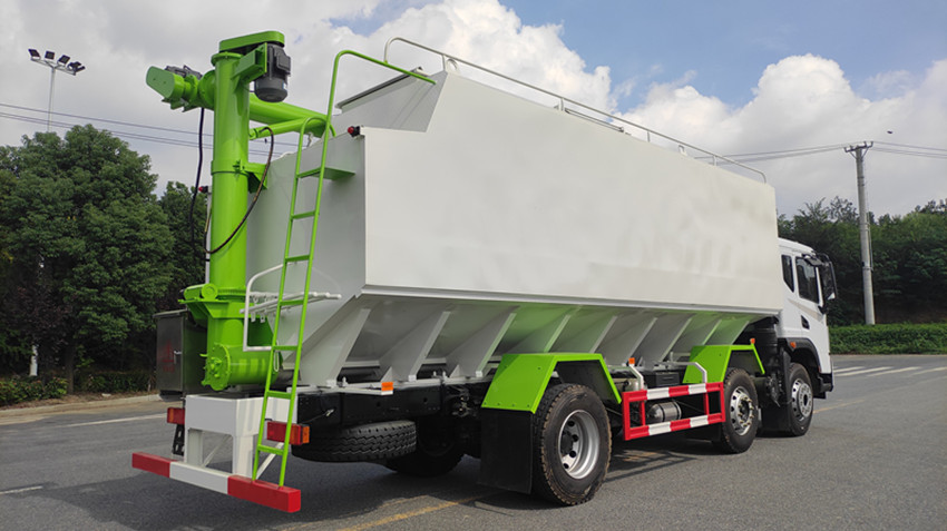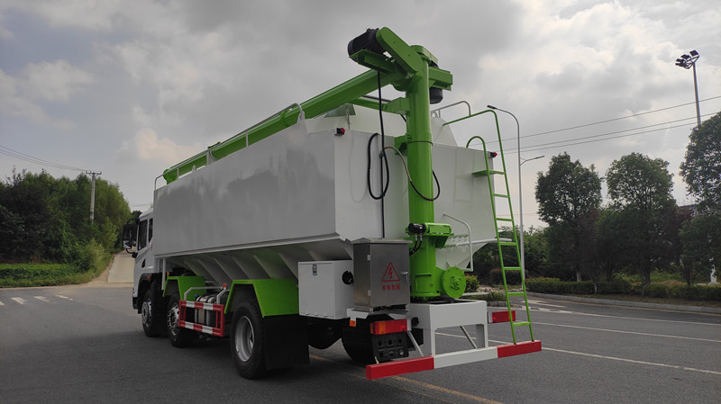 散裝飼料運(yùn)輸車(chē),散裝飼料車(chē)的飼料罐架設(shè)在卡車(chē)的底盤(pán)上,罐頂開(kāi)有進(jìn)料口.頂部的一根螺旋輸送卸料管(俗稱(chēng)卸料絞龍)則可自由回轉(zhuǎn)和抬升,抬升的仰角可達(dá)60度。運(yùn)輸時(shí),頂部的螺旋管平臥在罐頂;卸料時(shí)則抬起,使管端的出料口與畜禽飼養(yǎng)場(chǎng)貯料罐頂部的進(jìn)料門(mén)相接,駕駛室內(nèi)裝有操縱裝置(操縱裝置也可裝置在罐體尾部),卸料時(shí)通過(guò)車(chē)底的動(dòng)力輸出軸和減速器來(lái)驅(qū)動(dòng)螺旋,以完成卸料。