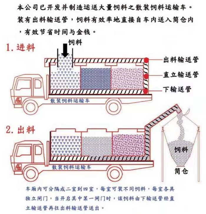 ★罐體內(nèi)可加裝分倉,可同時運輸多種不同類的飼料或膨人介質(zhì)。部件標(biāo)準(zhǔn)化,容易維修保養(yǎng)。